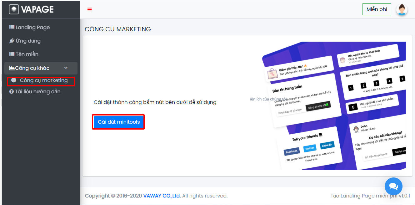 - Truy cập vào hệ thống landingpage, chọn Công cụ khác > Công cụ marketing > Cài đặt minitools.