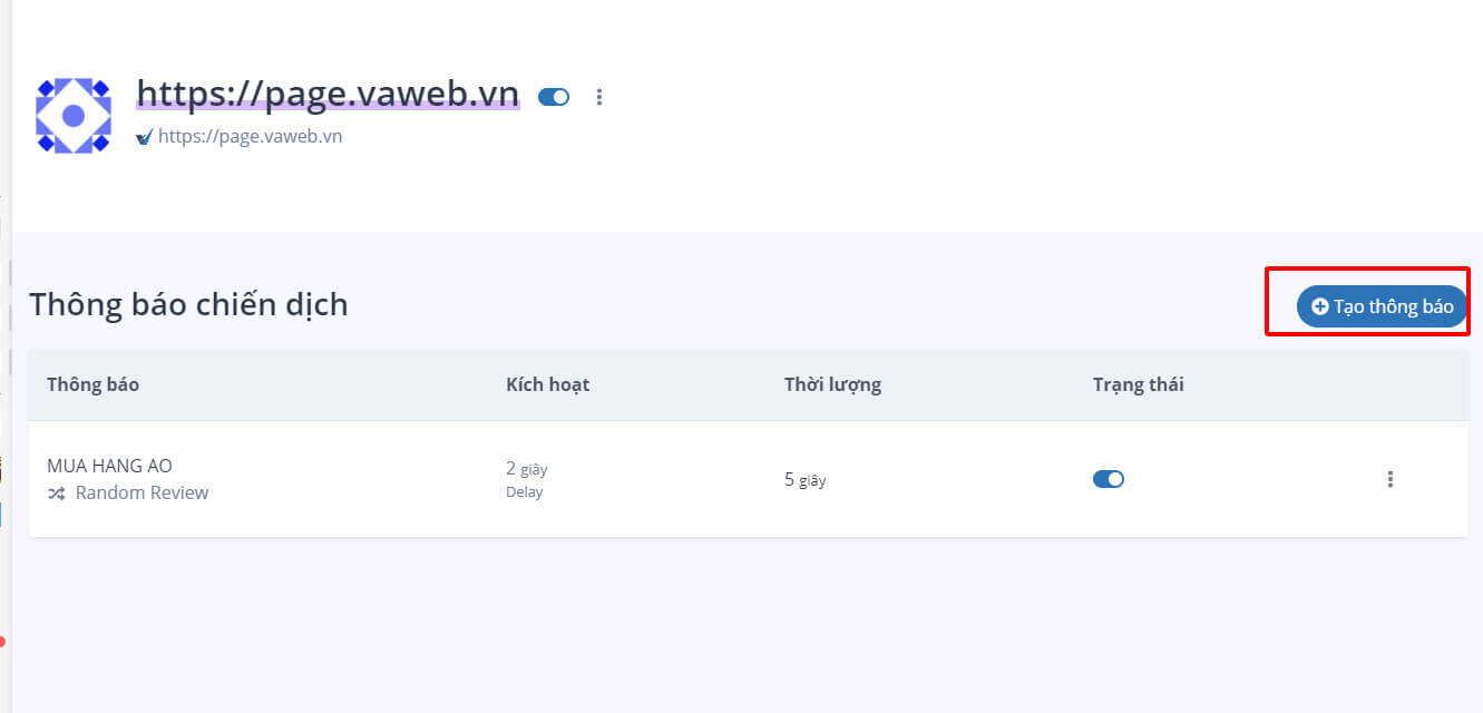 - Bấm vào linh website đã kết nối với công cụ > chọn Tạo thông báo.