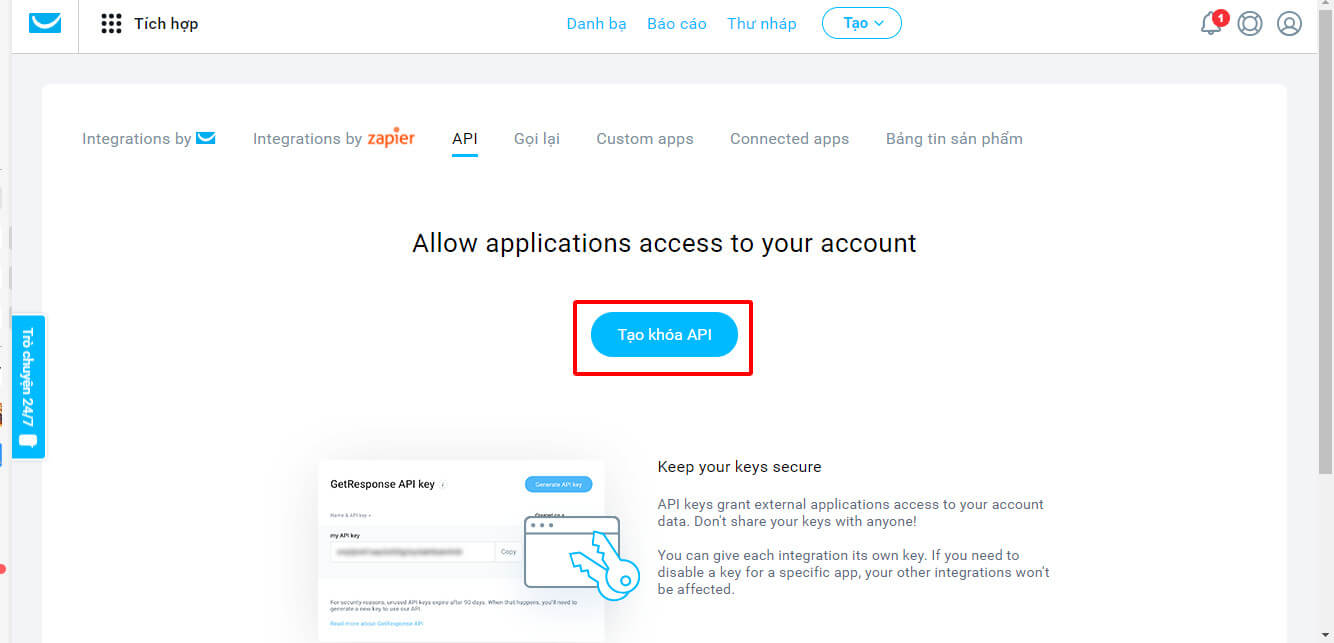 - Chọn vào biểu tượng Menu > Tích hợp > API > Tạo khóa API.