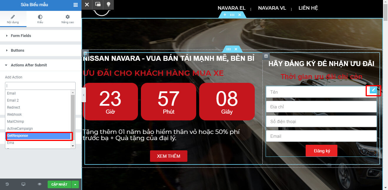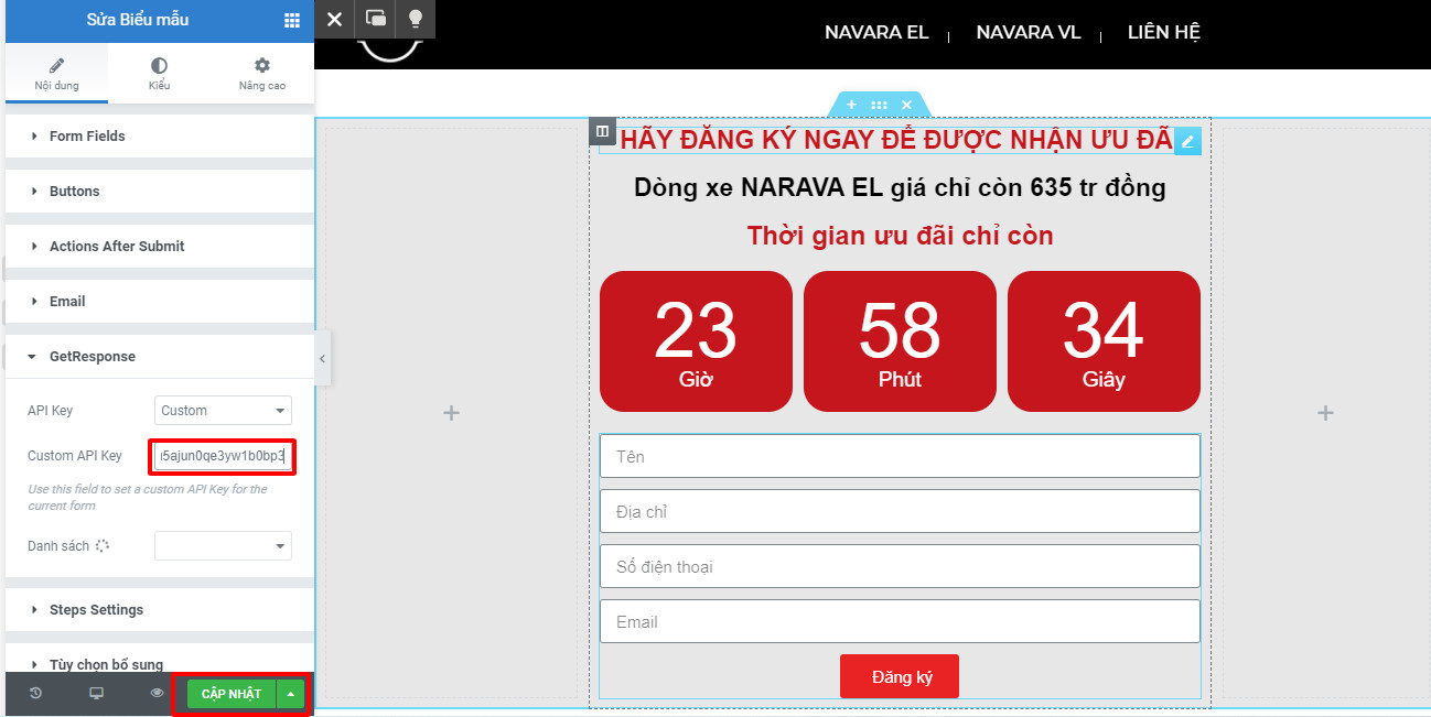 - Nhập mã Getresponse vào ô sau > bấm vào nút CẬP NHẬT.