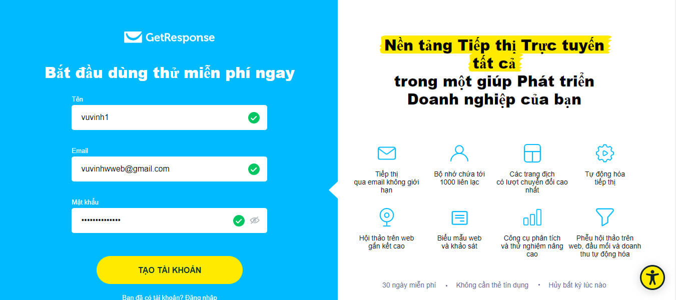 - Truy cập vào link https://app.getresponse.com/ > bấm chọn Đăng ký.