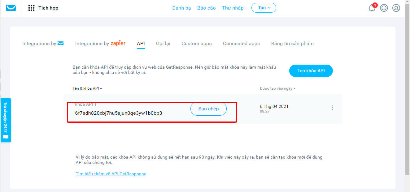 - Sau khi mã API được tạo thành công > quý khách copy mã API đó > dán vào phần 4. Nhập mã Getresponse là thành công.