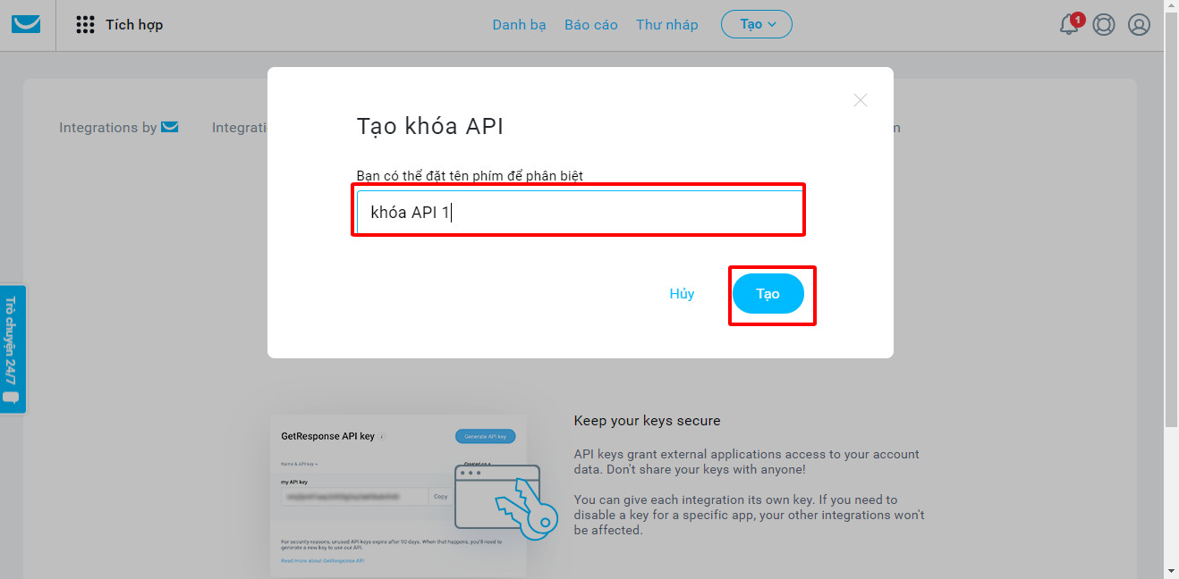 - Nhập tên cho khóa API > bấm nút Tạo.