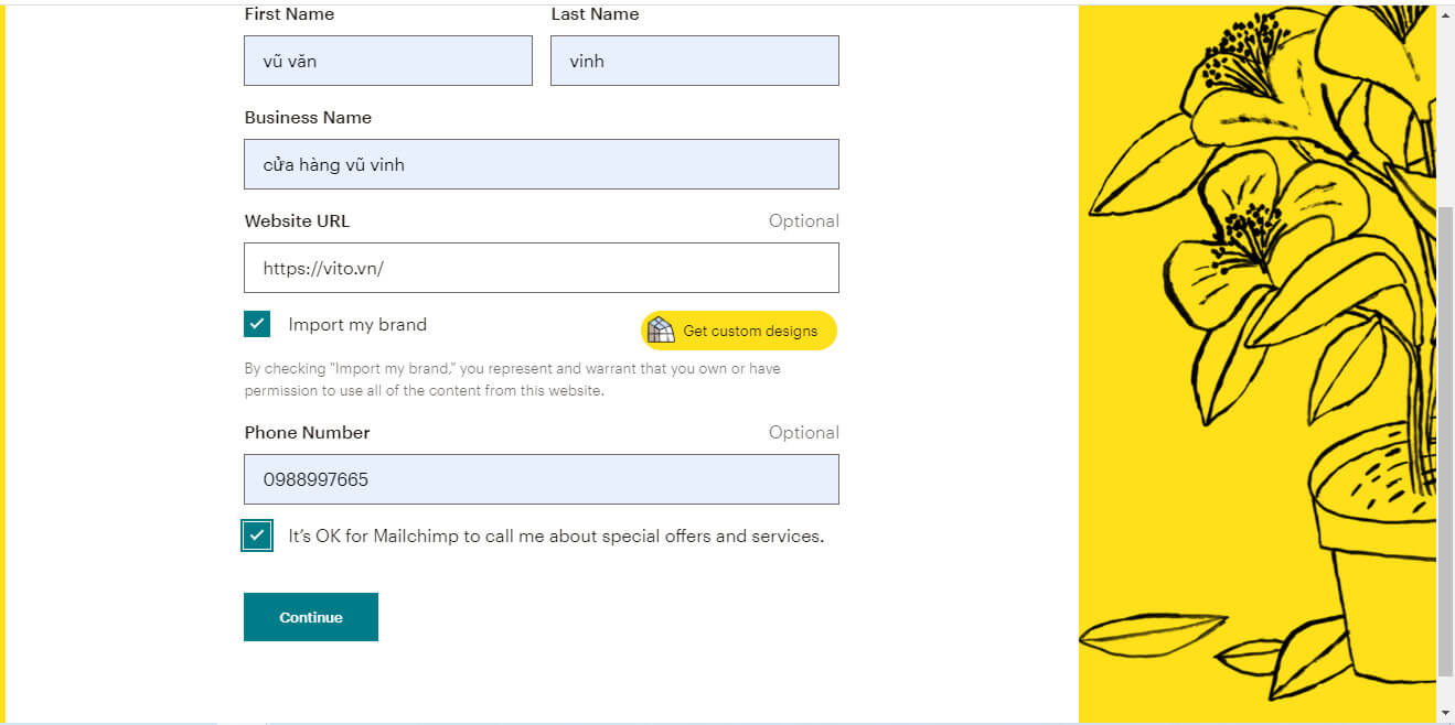 - Điền đầy đủ thông tin theo yêu cầu của hệ thống mailchimp > bấm vào nút Continue.