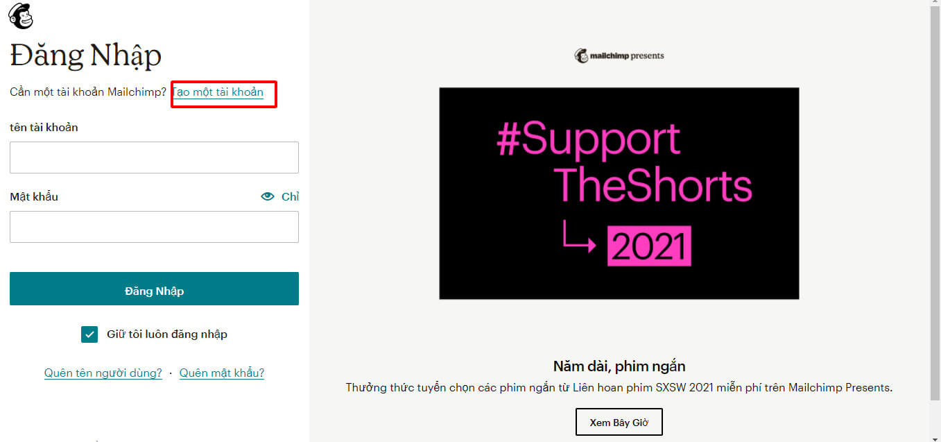 - Truy cập vào link https://login.mailchimp.com/?referrer=%2F > bấm chọn Tạo một tài khoản.