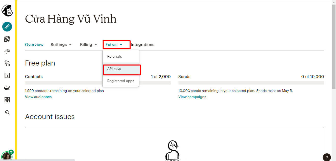 - Bấm vào biểu tượng tài khoản > chọn Tài khoản > Extras > API keys.