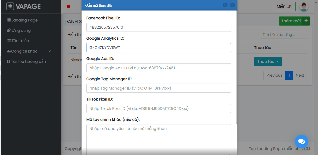 - Quay lại phần 1. Thêm mã Facebook pixcel,Google analytics, Tiktok, dán mã vào ô Google Tag Manager ID.