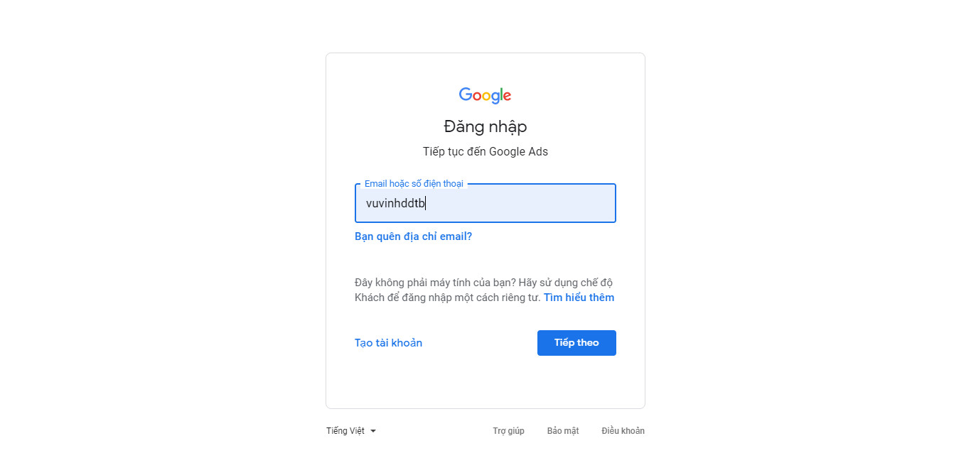 - Điền đầy đủ thông tin tài khoản gmail của quý khách > bấm vào nút Tiếp theo