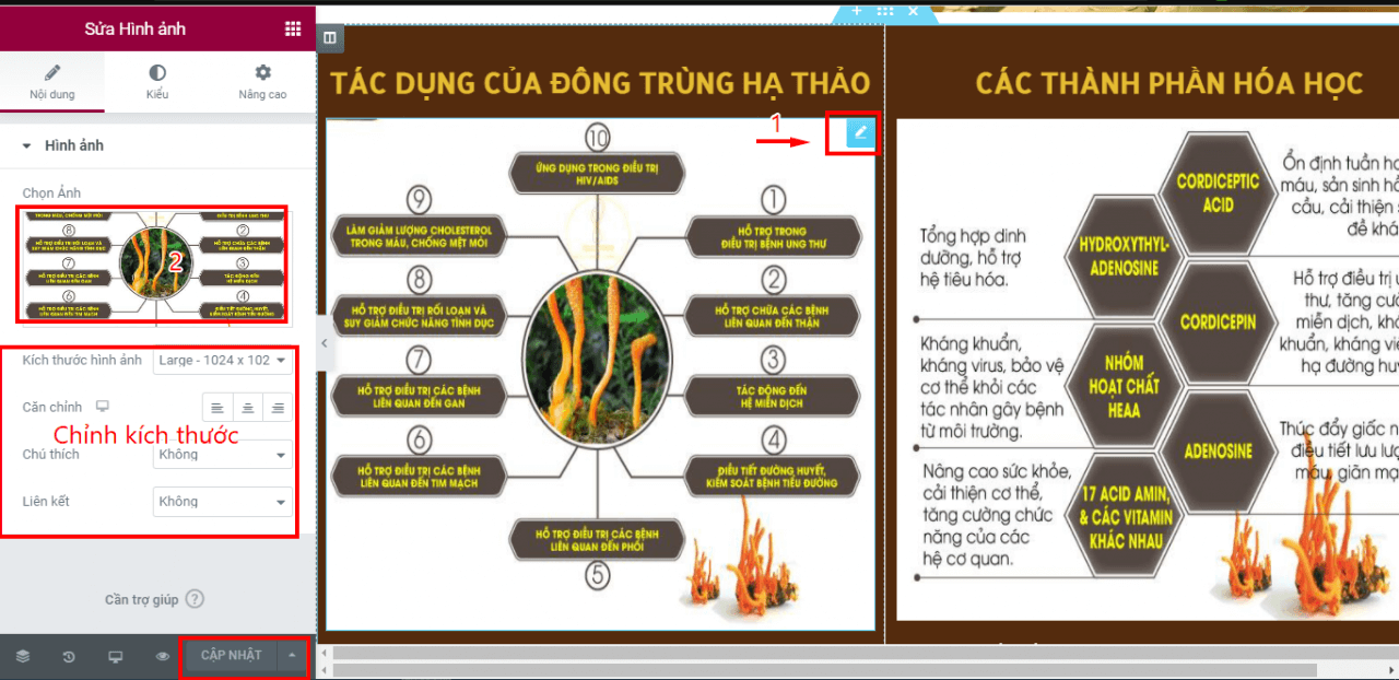– Bước 1 : Sau khi bạn truy cập vào trang để sửa landing page, bạn di chuyển chuột đến vị trí ảnh /click cái bút để sửa / thay ảnh sẽ nằm bên trái màn hình / click trực tiếp vào ảnh để thay / căn chỉnh kích thước ảnh ở phía dưới . Sau khi chỉnh xong bạn click cập nhật hoàn thành thay ảnh.