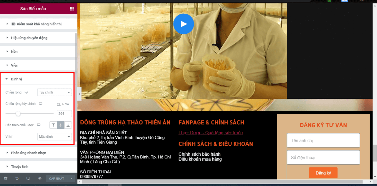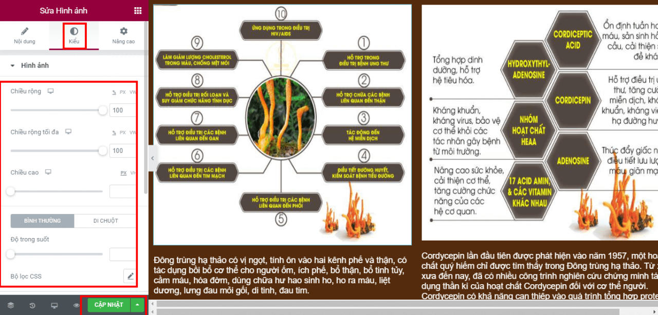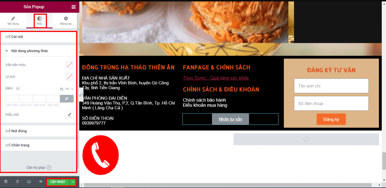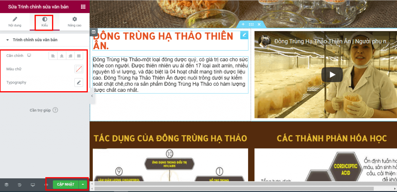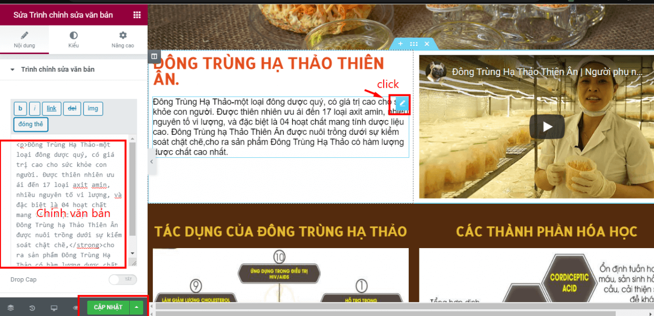 – Bước 1 : Click cái bút chỗ text bạn cần sửa/ bạn chỉnh sửa văn bản ở cột bên trái, sửa trình chỉnh văn bản . Sau khi thay xong bạn click cập nhật để hoàn thiện.