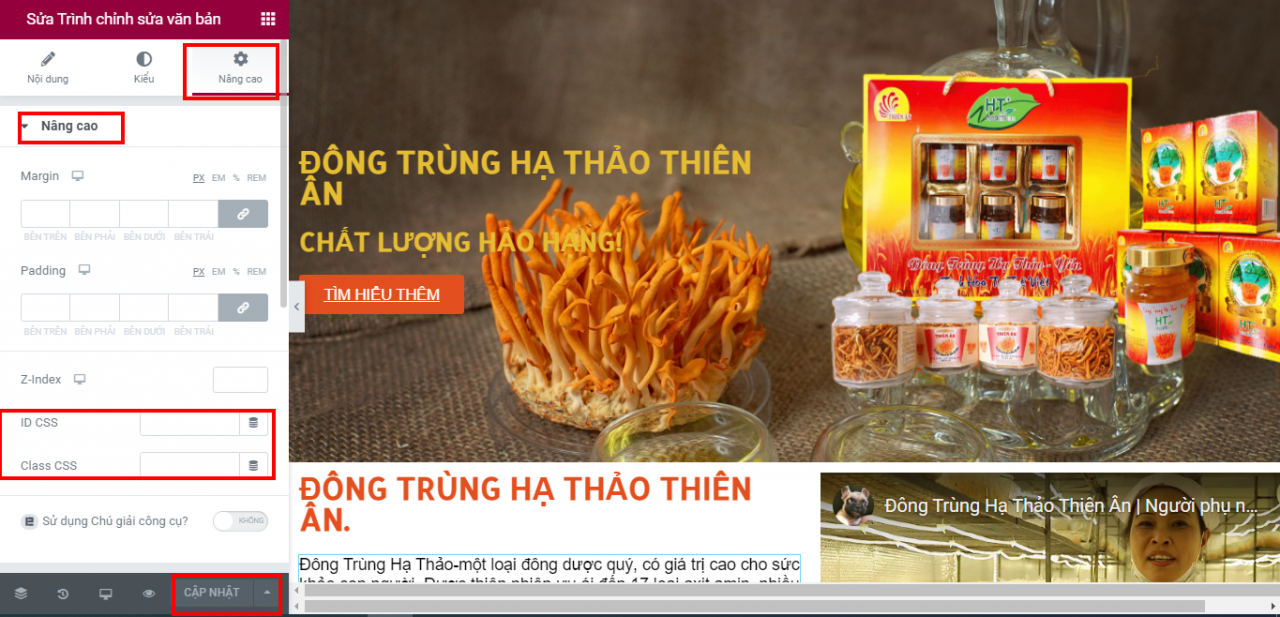 - Bước 3 : Bạn click mục nâng cao ( **phần này chỉnh khoảng cách nội dung với cột, chỉnh nền và viền khối, responsive là hiển thị hoặc ẩn trên các thiết bị, nhập id css là khi bạn nhập tên bạn đặt ở khối đó và bạn sao chép tên đó ở chỗ liên kết mục khác thì khi kích vào mục mà bạn gắn lập tức nó sẽ di chuyển đến phần mà id css mà ban đầu bạn đặt tên.**