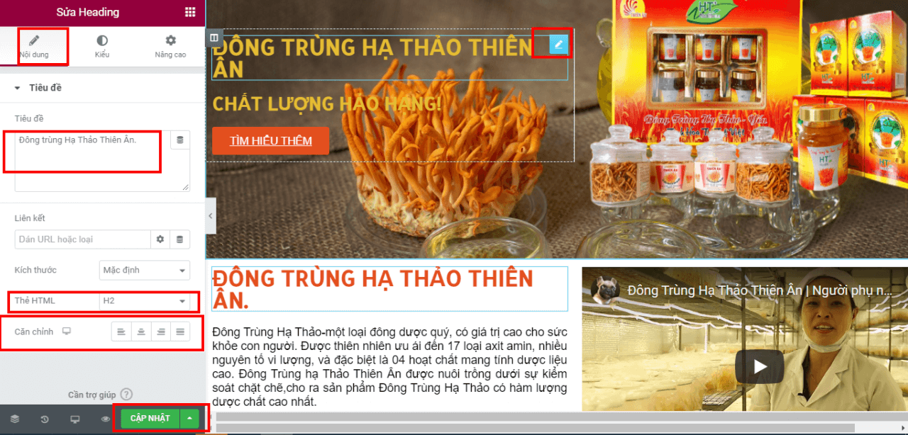- Bước 1: Bạn click bút chữ tiêu đề bạn cần sửa ( chữ tiêu đề thường là chữ to) / bạn chỉnh sửa tiêu đề cột sửa heading phần nội dung, căn chỉnh lề cho tiêu đề