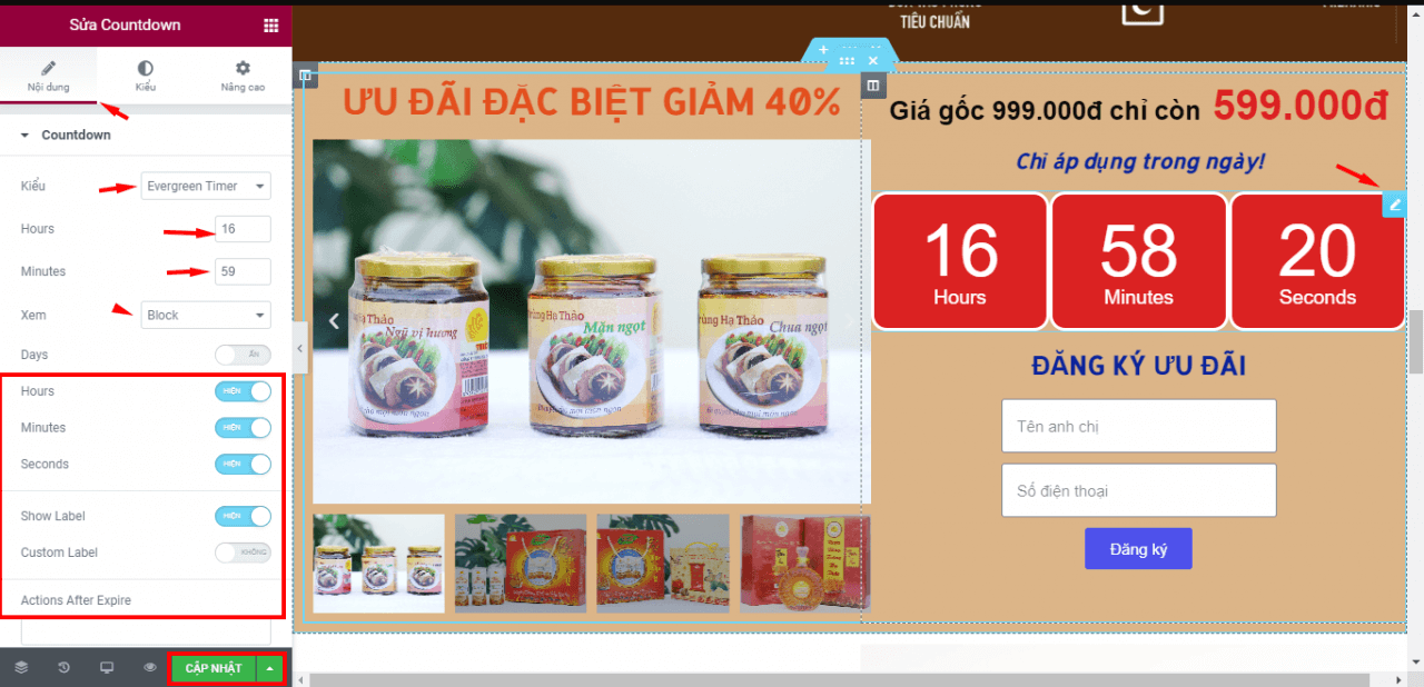 - Bước 1 : Click cái bút phần chạy thời gian / chỉnh nội dung gồm có kiểu chọn Evergreen timer, ghi thời gian giờ và phút, bật chế độ hiện thời gian và ấn cập nhật lưu lại.