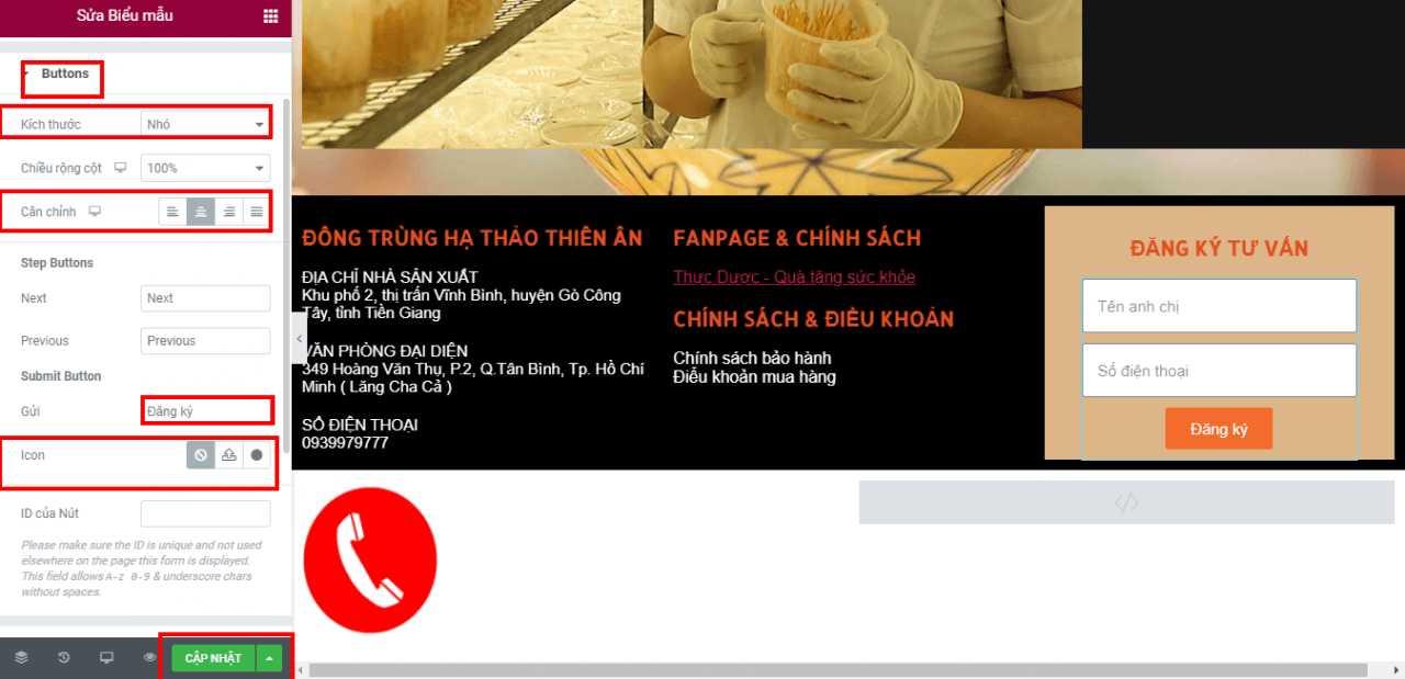 Bước 2 : Mục button bạn thay tên ở chỗ phần gửi, căn chỉnh button, chọn icon nếu thích