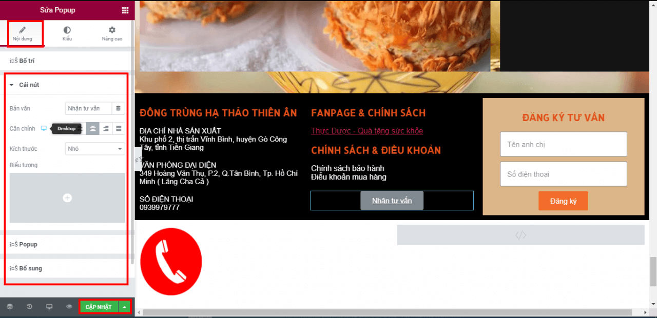 Bước 2 : Chỉnh sửa popup ở cột bên trái gồm có sửa bố trí , cái nút , nội dung popup. bạn ấn cập
