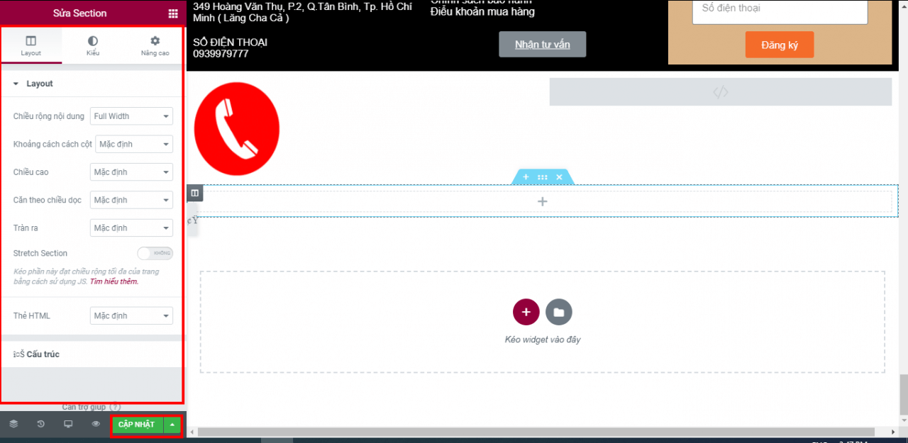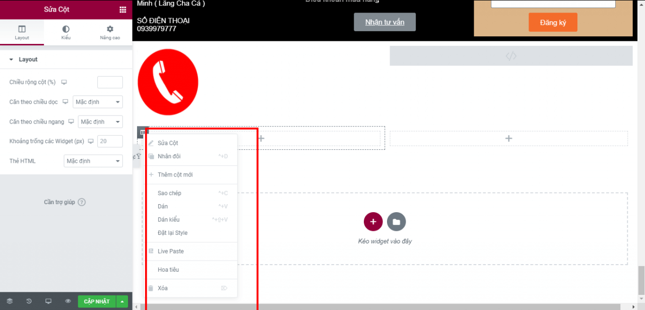 *section** thường thì chỉ có 2 cột / thêm cột bạn click ô vuông chuột phải và tùy chọn nhân đôi,