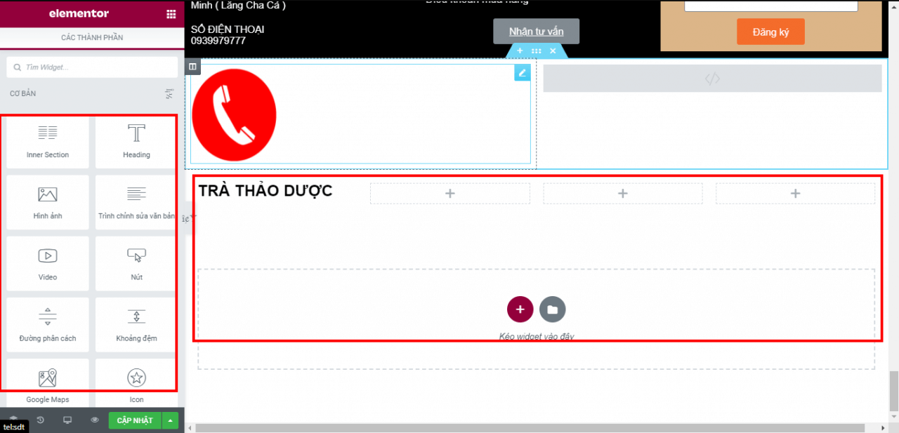 – Bước 2 : Bạn chọn 9 dấu chấm ở trên đầu chỗ Elementor / kéo inner section vào khối *