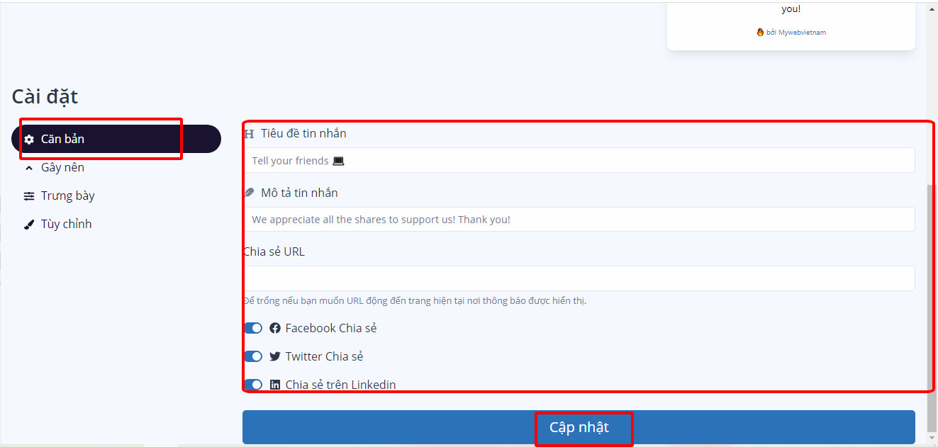 - Bấm chọn Căn bản > điền đầy đủ thông tin > bật/ tắt chế độ của các phần: Facbook chia sẻ, Twitter chia sẻ, chia sẻ trên Linkedin > bấm vào Cài đặt.