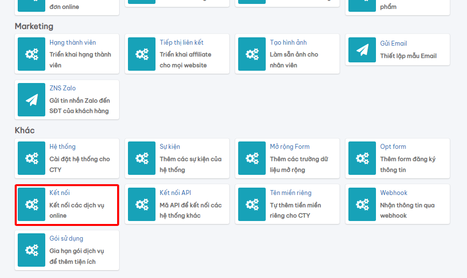 Kết nối Chọn thiết lập hệ thống – Chọn kết nối:Cập nhập thêm.ArticlesThanh toán OnlineBán hàng tự động webinarEmail marketingDocDoc navigation← Nhân viên & cộng tác viênTài khoản → Was this article helpful to you? Yes No How can we help? Name Email subject message