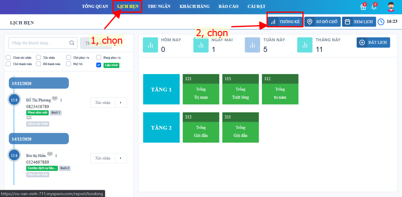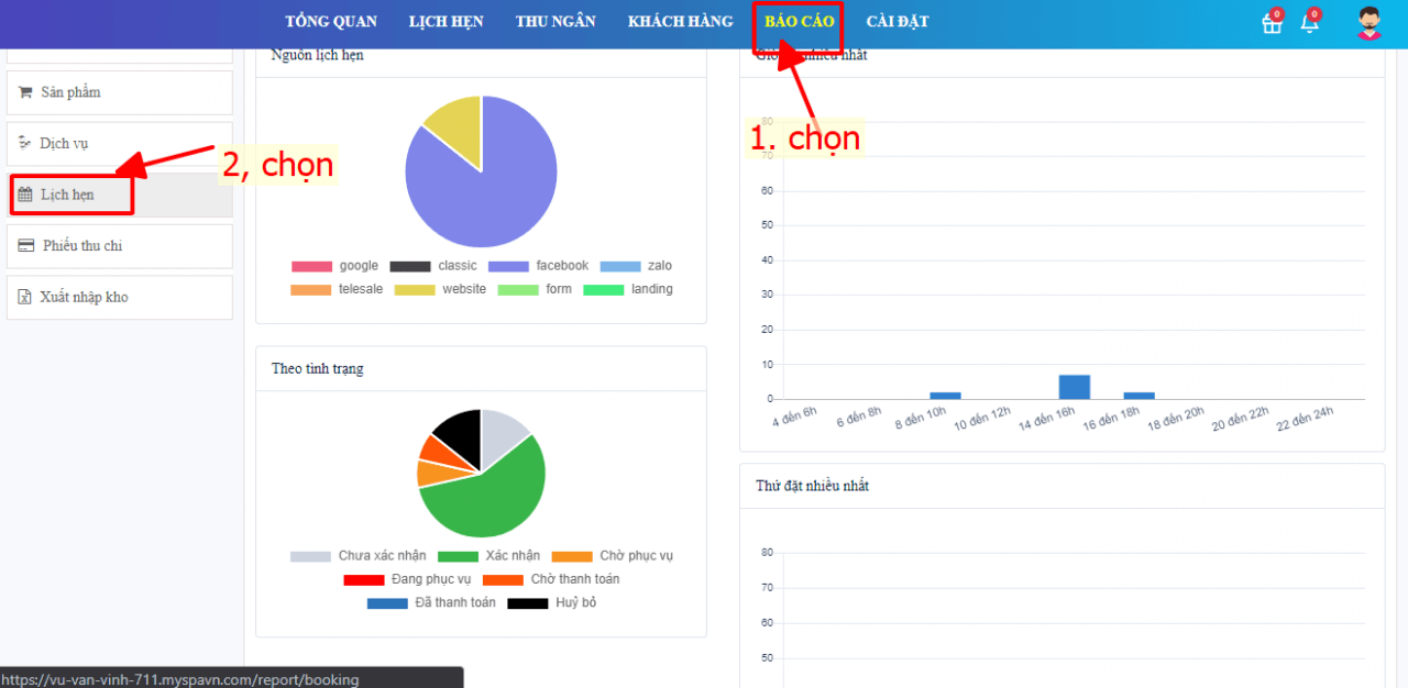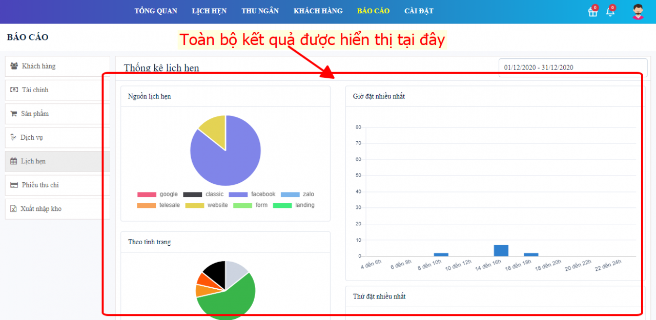 Báo cáo lịch hẹn Cách 1: Truy cập Lịch hẹn –> Thống kê Kết quả hiển thị thành công như sau Cách 2: Truy cập Báo cáo –> Lịch hẹnKết quả hiển thị thành công như sau Doc navigation← Báo cáo nhân viên Was this article helpful to you? Yes 1 No How can we help? Name Email subject message