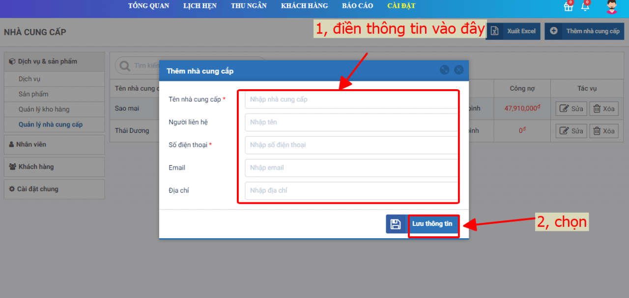 - B2: Điền thông tin nhà cung cấp –> Bấm chọn nút Lưu thông tin