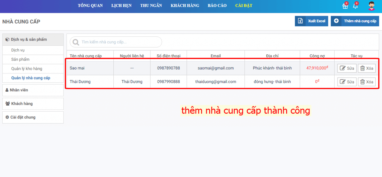 Kiểm tra kết quả thêm nhà cung cấp