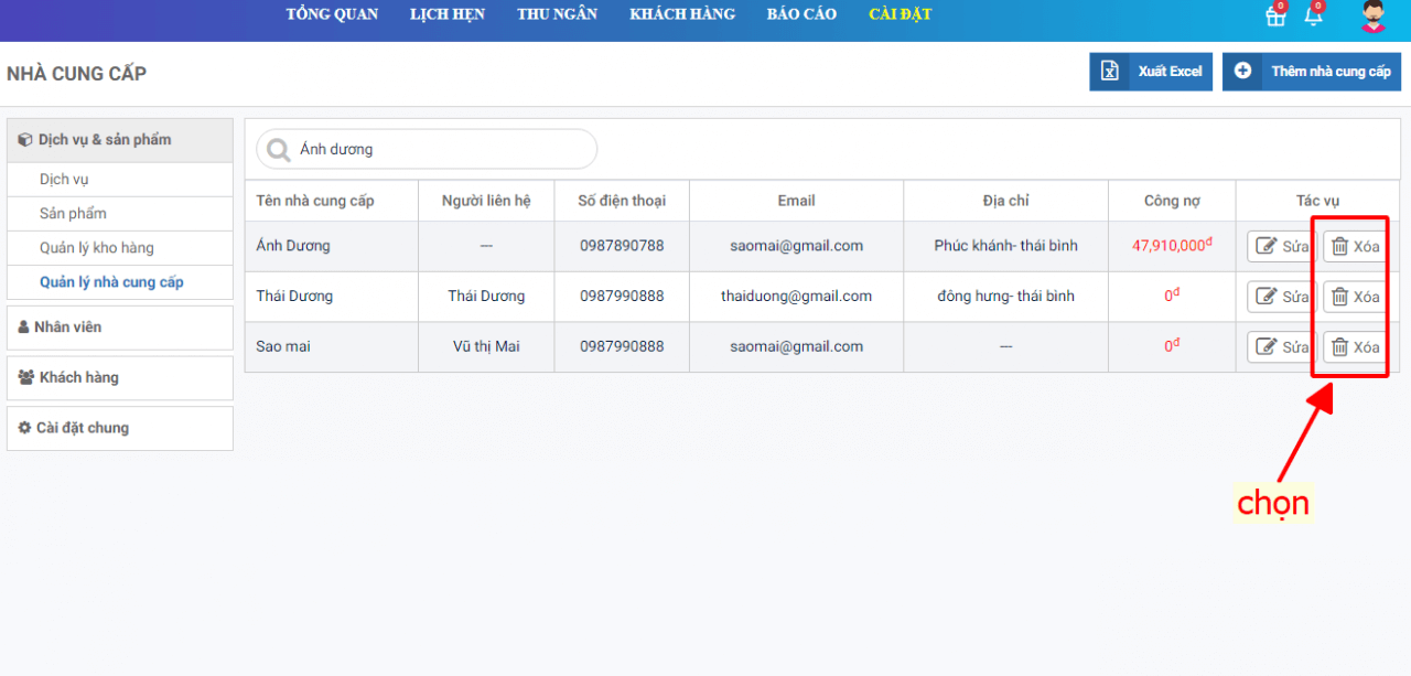 - B2: Tìm kiếm nhà cung cấp cần xóa và chọn vào biểu tượng nút xóa