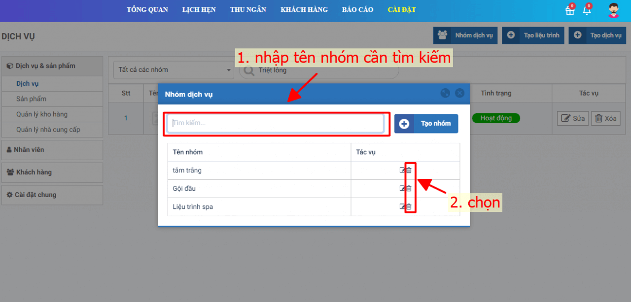 - B2: Tìm kiếm và chọn 1 nhóm dịch vụ cần sửa