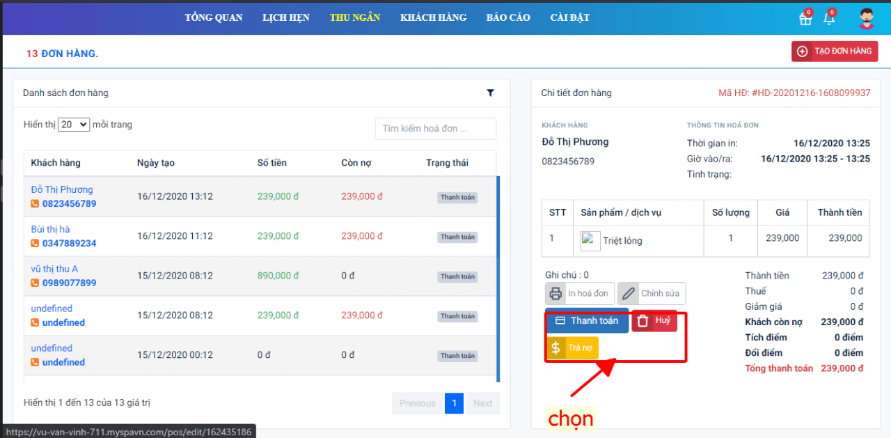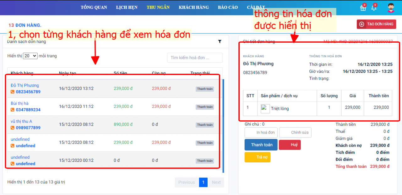 - B1: Truy cập: Thu ngân –> Danh sách hóa đơn