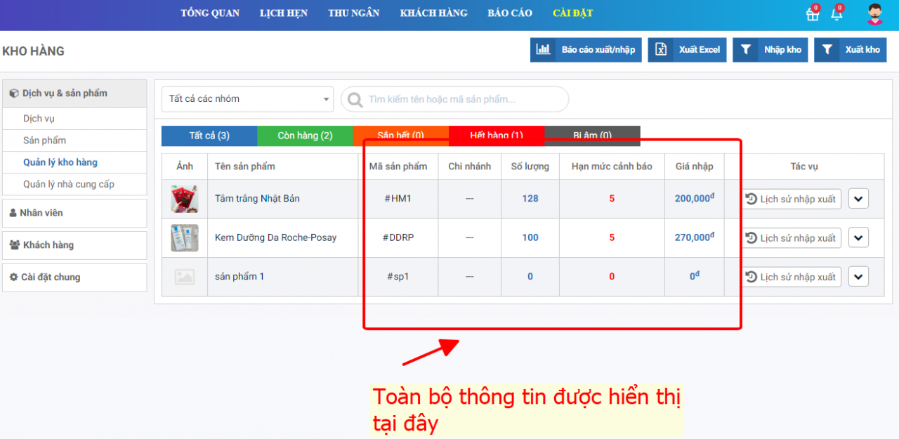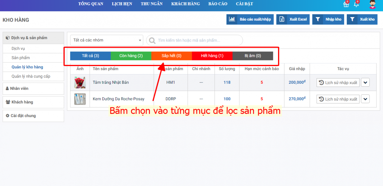 Lưu ý: Quý khách có thể bấm vào từng mục Còn hàng, sắp hết, hết hàng, bị âm để xem chi tiết từng mục.