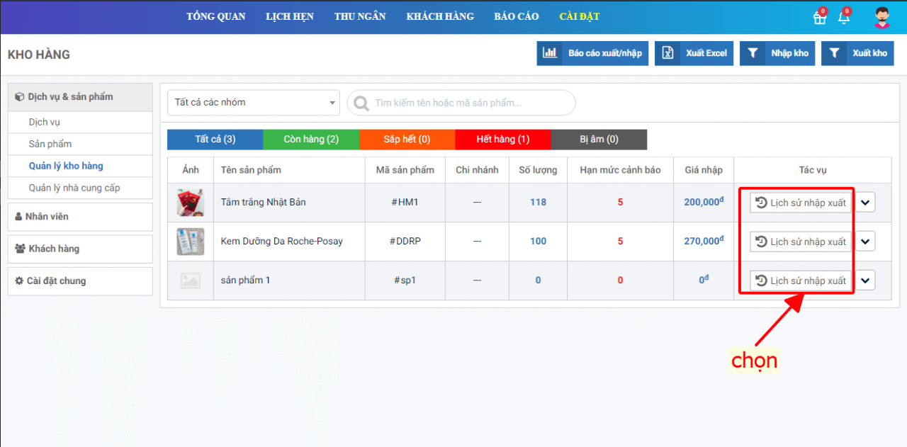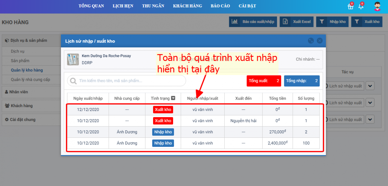 2. Xem lịch sử nhập xuất từng sản phẩm