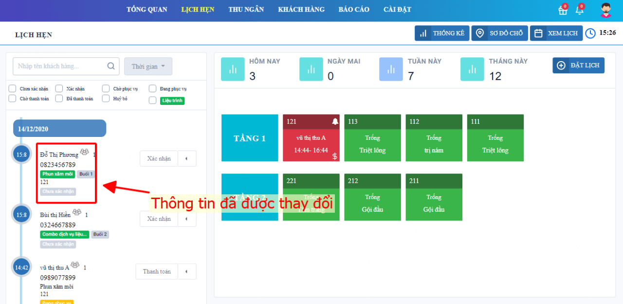 Kết quả chỉnh sửa lịch hẹn dịch vụ liệu trình thành công