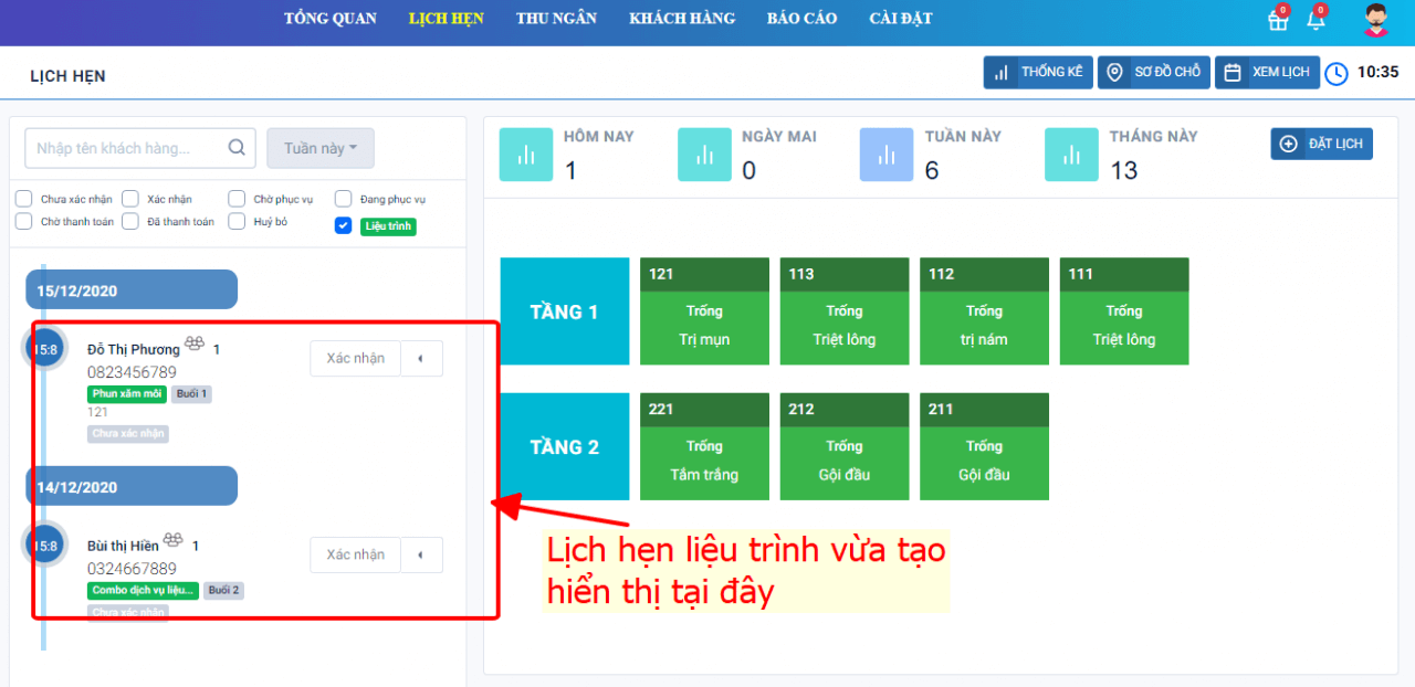 Kết quả sau khi thêm lịch hẹn dịch vụ liệu trình