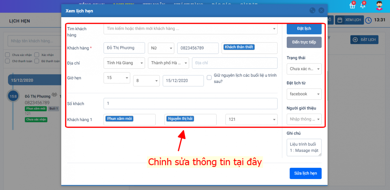 2. Chỉnh sửa lịch hẹn dịch vụ liệu trình