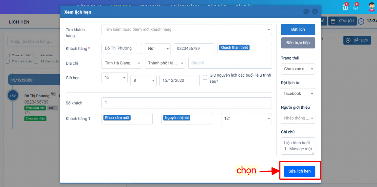 - B2: Tìm kiếm và chọn lịch hẹn liệu trình cần chỉnh sửa