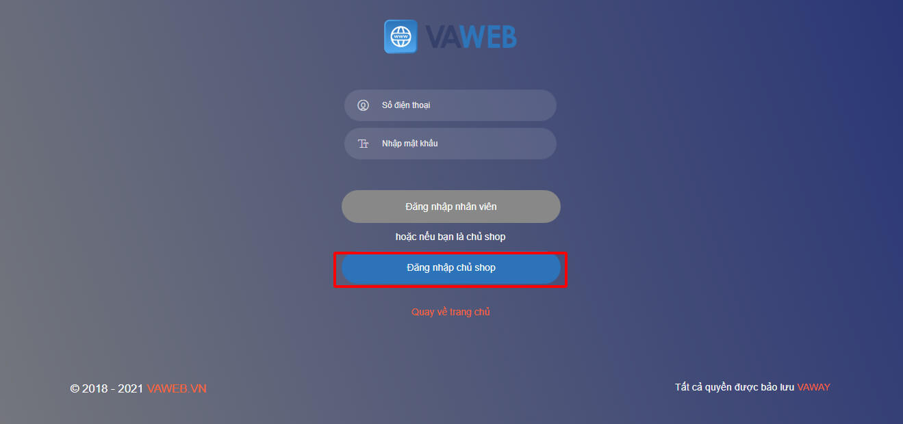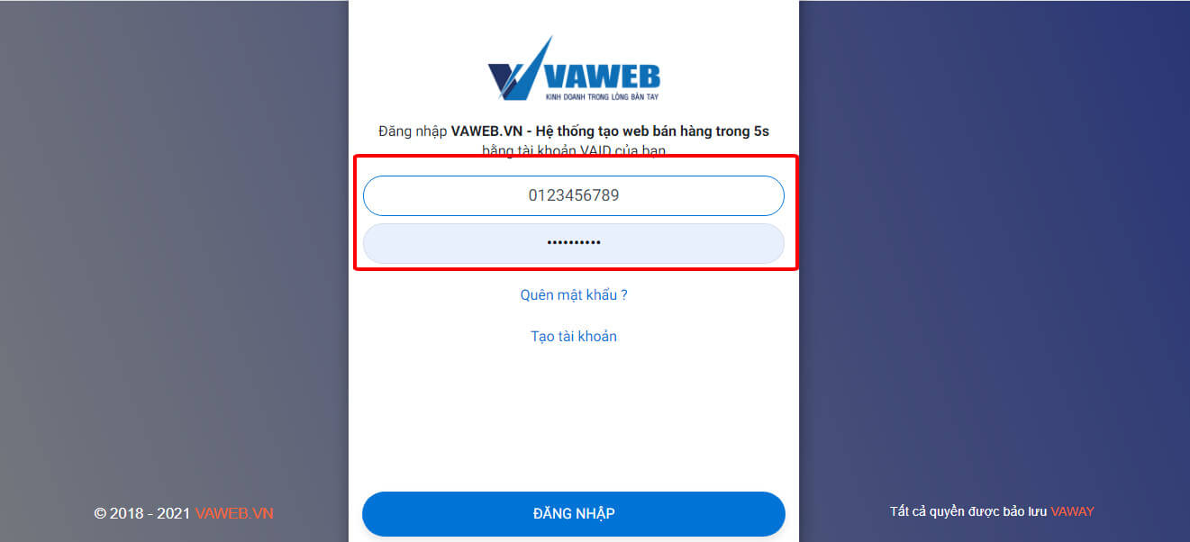 Lưu ý: Tài khoản của quý khách để đăng nhập vào website là tài khoản mà quý khách đã nhập sau khi tạo website thành công.