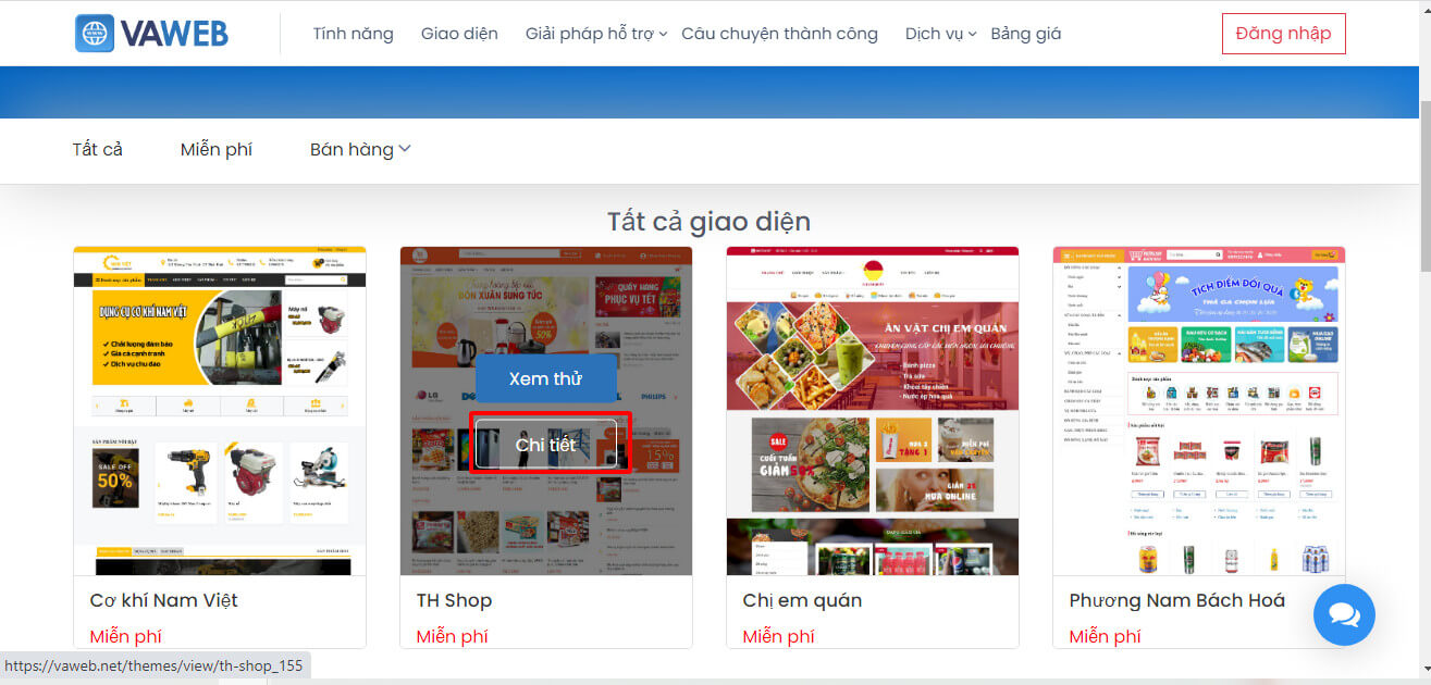 - Chọn Giao diện > chọn 1 giao diện muốn tạo website > chọn Chi tiết.