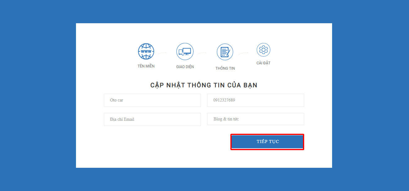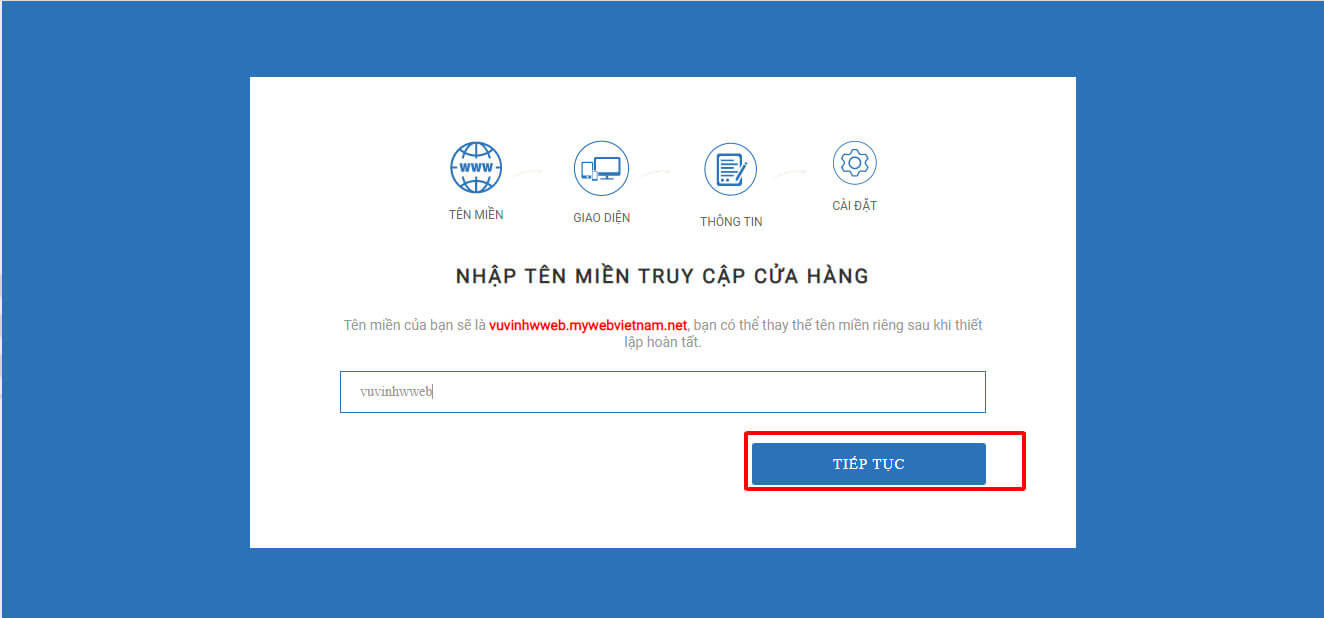 - Điền tên miền mà quý khách muốn đặt cho website > bấm nút TIẾP TỤC.