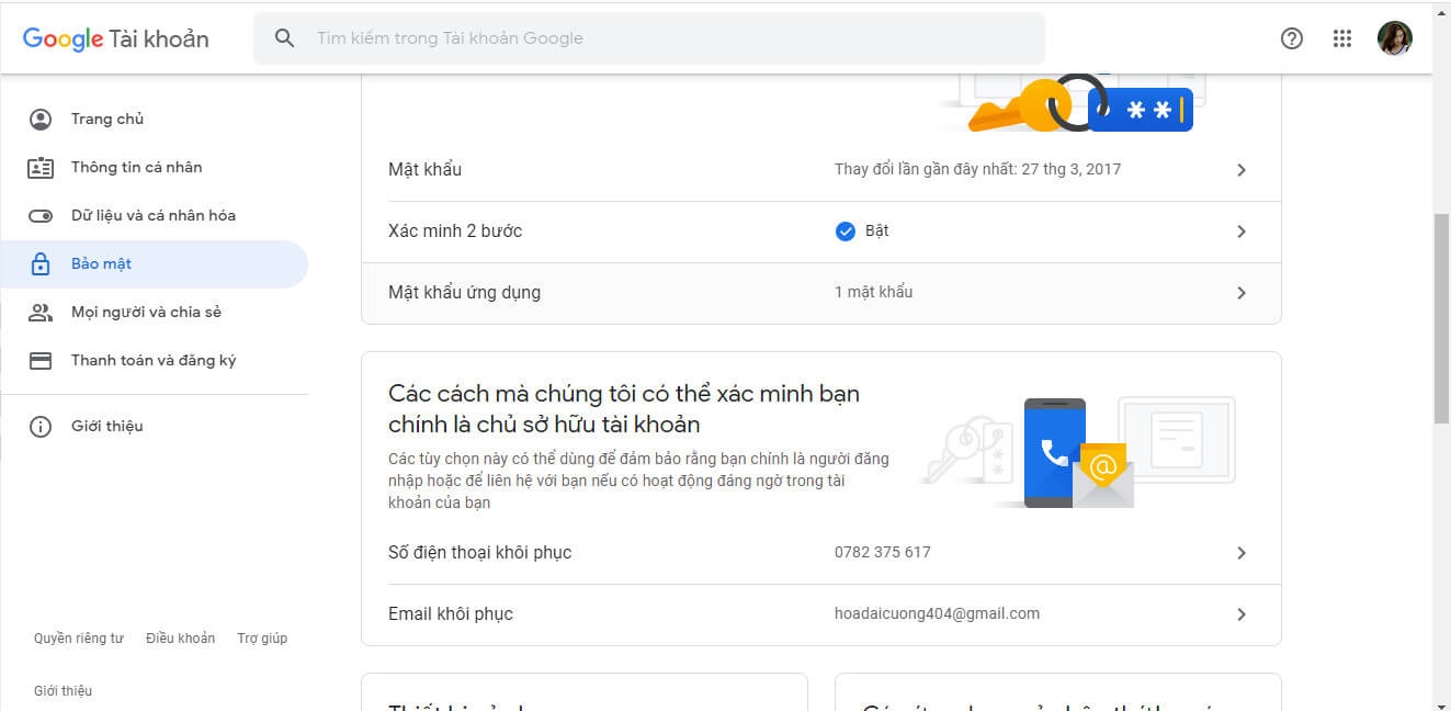 - Tại trang quản lý tài khoản của Gmail, chọn Bảo mật > Xác minh 2 bước.