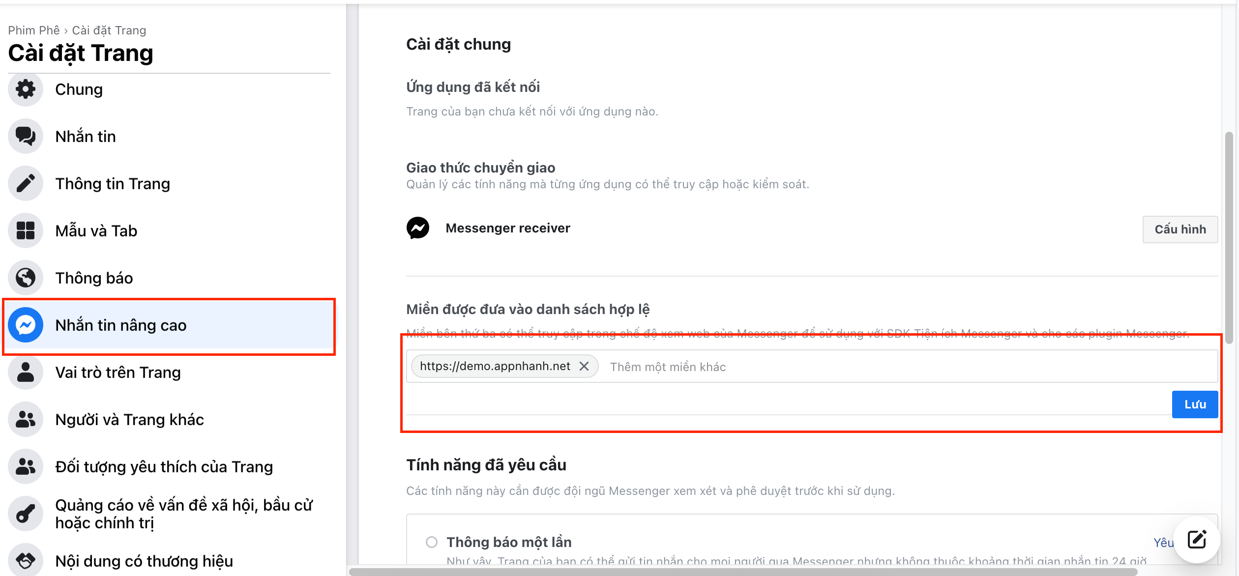 - Chọn Nhắn tin nâng cao kéo xuống dưới điền thông tin tên miền của bạn và bấm Lưu