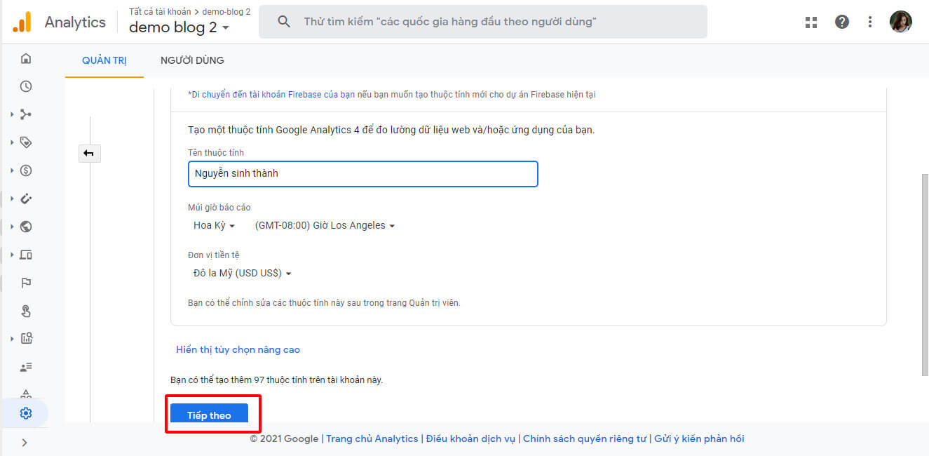 - chọn Quản trị > Tạo thuộc tính > điền thông tin vào phần tạo thuộc tính > bấm chọn Tiếp theo.