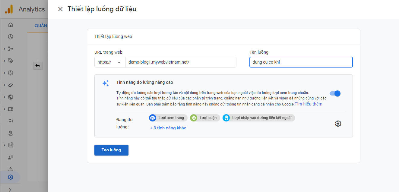 - Chọn Luồng dữ liệu > Thêm luồng > web > nhập link website vào đây > điền tên luồng > Tạo luồng.