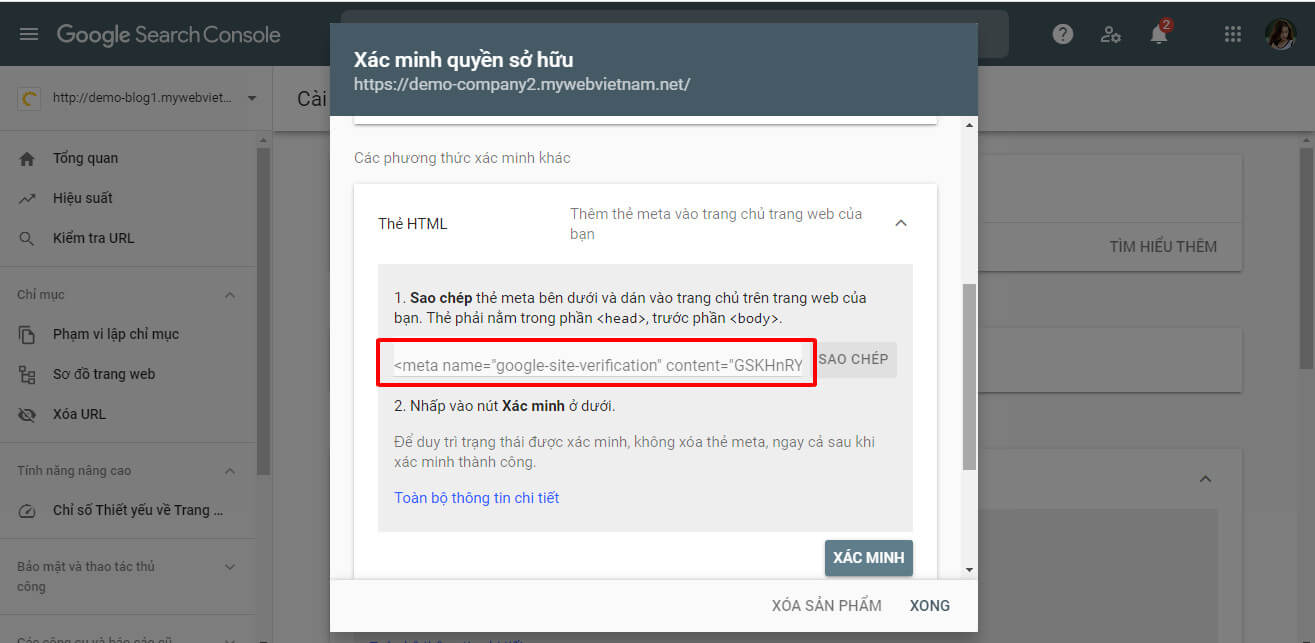 - Quay sang trang Google seach console > bấm chọn Xác minh là hoàn thành.