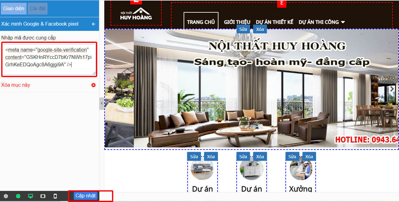 - Quay lại trang quản trị website> dán mã HTML vào > Bấm nút Cập nhật.
