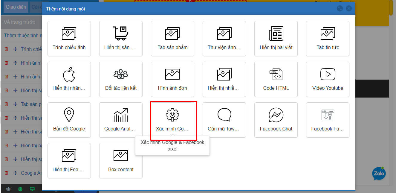 - Bấm chọn thuộc tính > chọn thuộc tính Xác minh google hoặc Facebook pixcel.