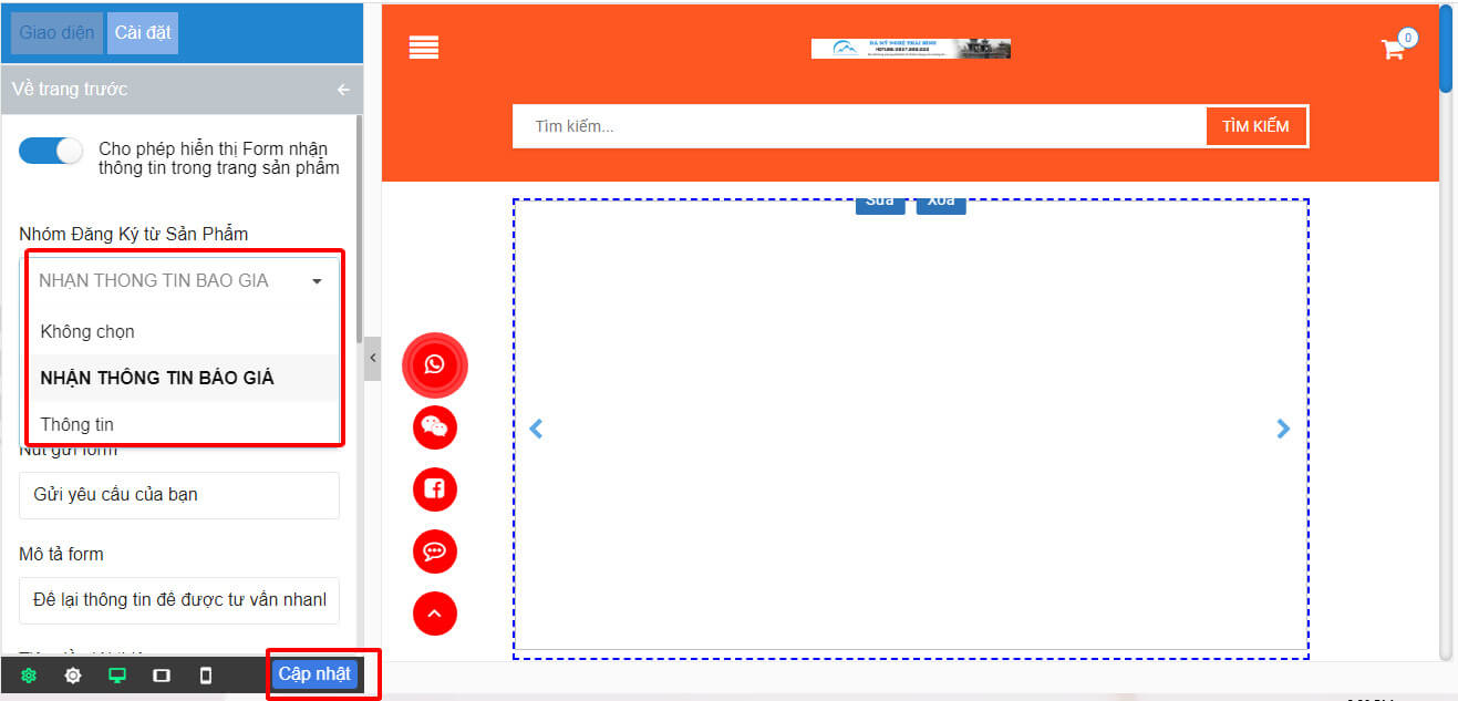 - Chọn vào Cài đặt > Form đăng ký > chọn 1 form đăng ký > bấm nút Cập nhật.