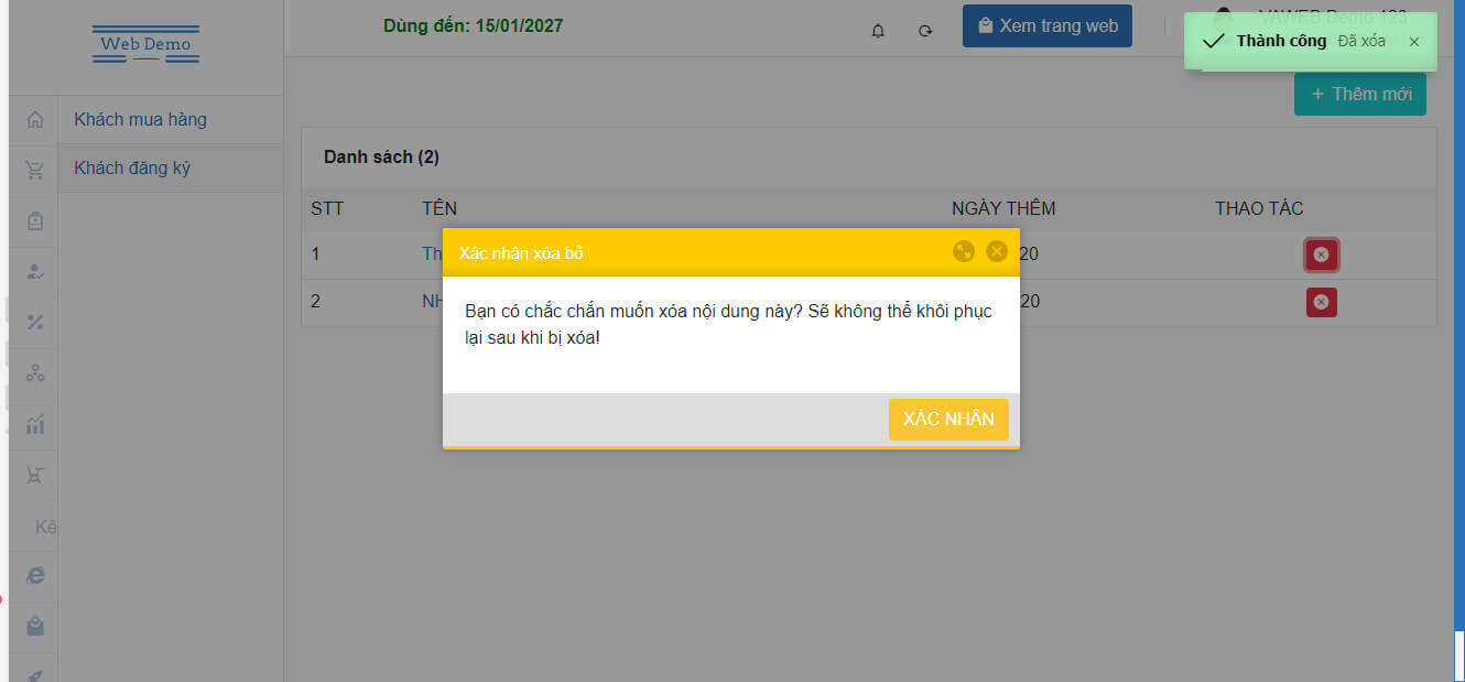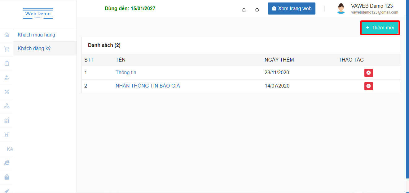 - Toàn bộ danh sách khách hàng đăng ký sẽ hiển thị tại đây.
