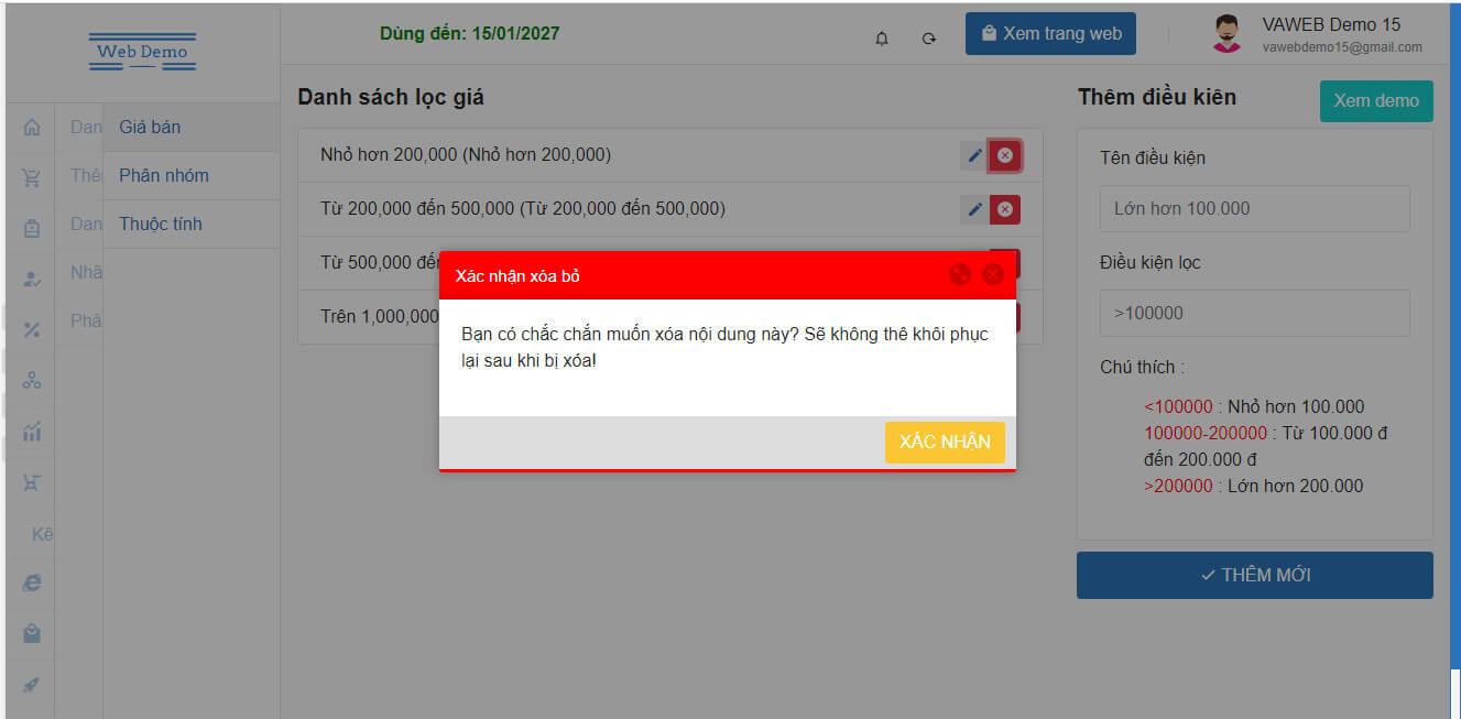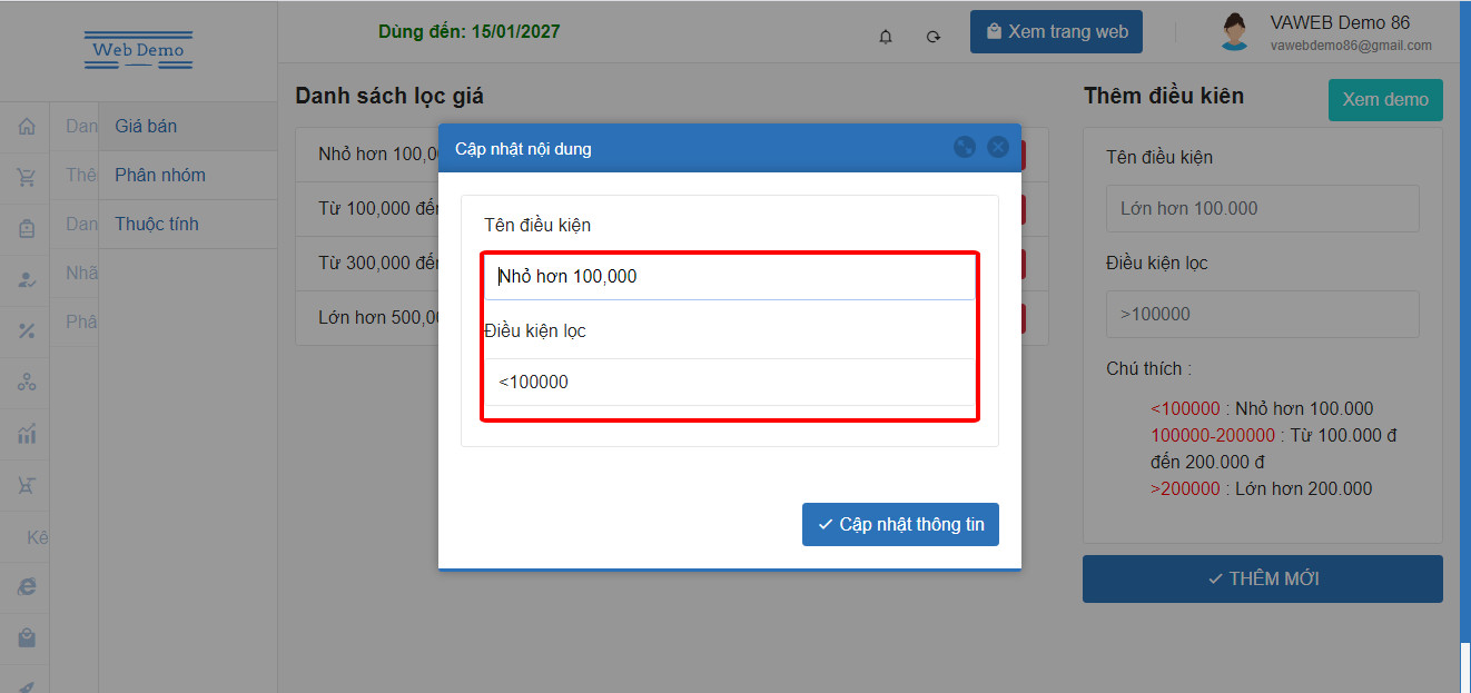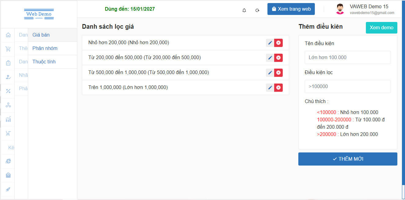 - Đăng nhập quản trị chọn Sản phẩm > Phân loại > Giá bán.