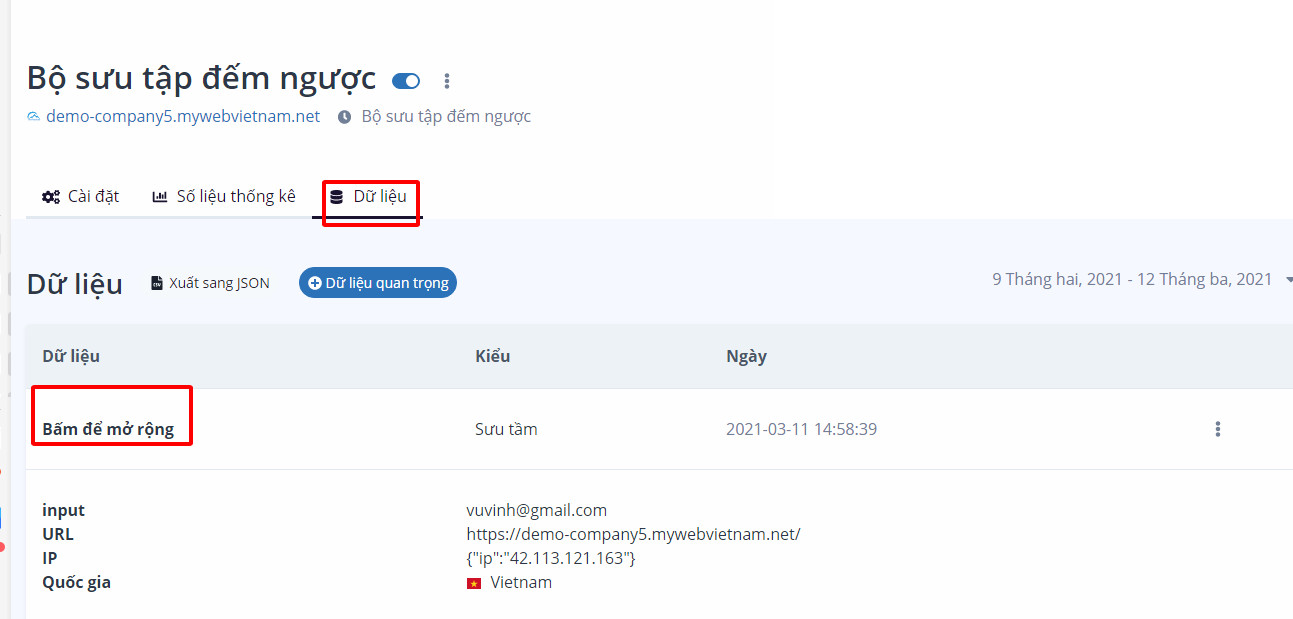 Lưu ý: – Để kiểm tra email khách hàng đã nhập vào tiện ích Bộ sưu tập đến ngược, quý khách chọn vào Dữ liệu. (xuất hiện ở thanh menu ngang) > bấm chọn Bấm để mở rộng.