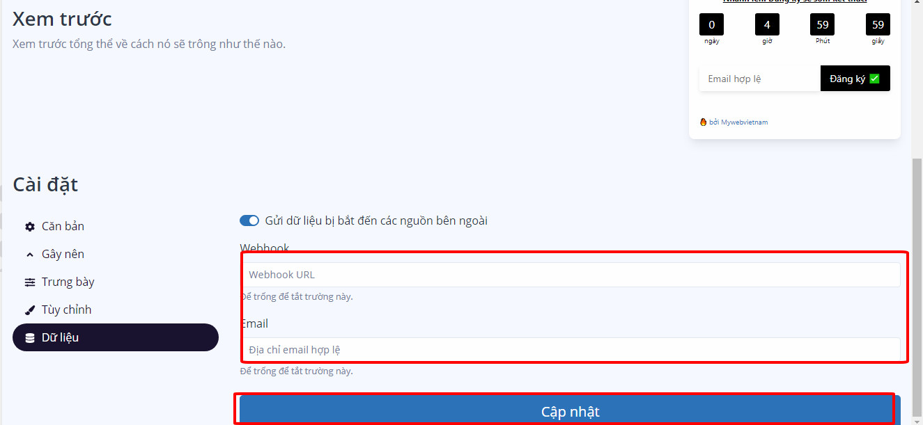 - Các mục: Căn bản, Gây nên, Tùy chình, Dữ liệu, Trưng bày thì quý khách không nhất thiết phải điền hết tất cả các mục này. Khi đó, tiện ích vẫn hiển thị được ra ngoài trang chủ.